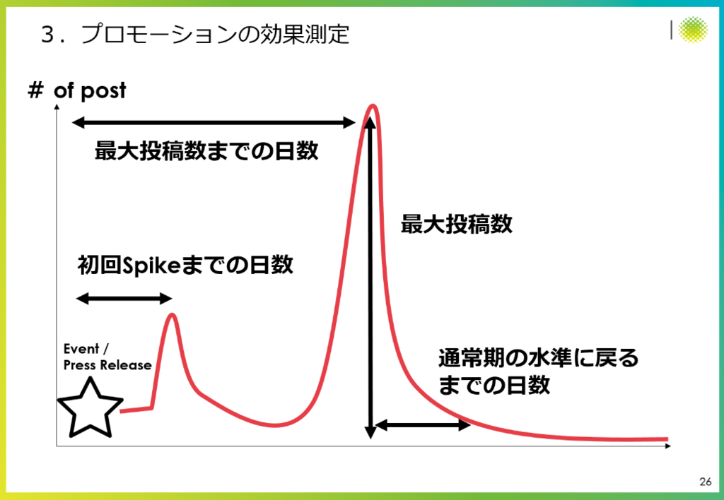 施策に対してソーシャル上でどういった反響・評価があるかを測定します。何らかのイベントを実施した際に、最初のスパイク(瞬間的な上昇)までの日数(時間の場合もある)、または最大投稿数までの日数(or 時間)がどれくらいかかったかで、初速が比較できます。次に、最大投稿数がどれくらいあるのかは非常にわかりやすい指標と言えるでしょう。さらに、スパイクがあると必ず通常期に戻りますが、その戻り方も重要です。1日で戻るのか、数日間の残存効果があるのかはプロモーションの効果指標になるのではないでしょうか?