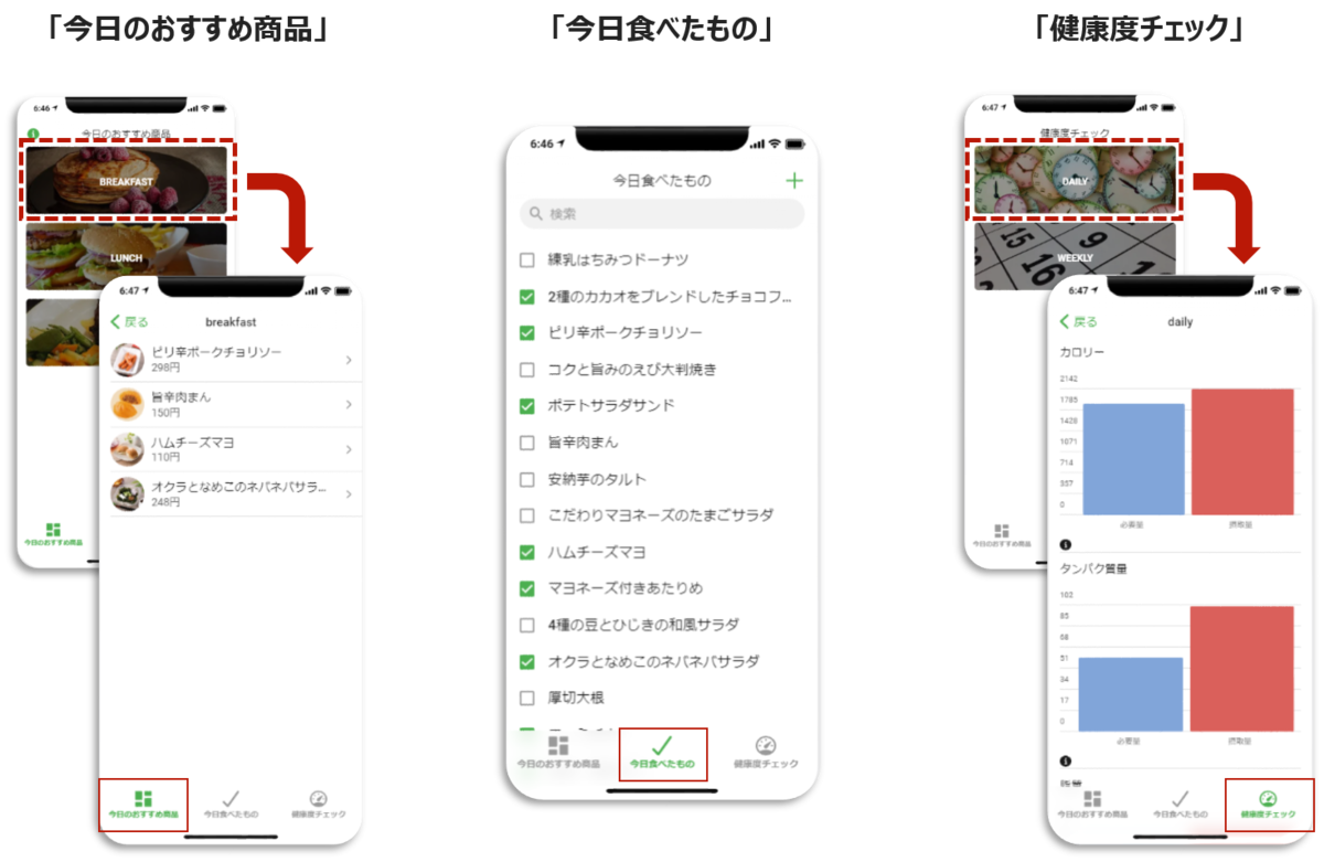 今回作成したアプリの画面は、今日のおすすめ商品タブ、今日食べたものタブ、健康度チェックタブ、の3つで構成されています。
