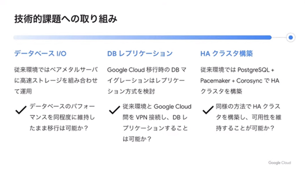 Google Cloud への移行前は、約200台の仮想マシンとベアメタルサーバーでインフラを構築していました。これを最小限のダウンタイムで Google Cloud へ移行するには、上記ポイントのとおり「技術的課題」と「本番移行に向けての課題」に向き合い、事前にできる限りの想定・解決をしておくことが非常に重要でした。