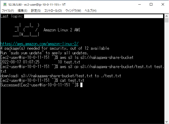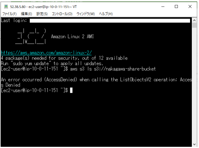 次にアカウントAでEC2インスタンスを起動し、TeraTermでSSH接続後にアカウントBのバケットにアクセスできるか試してみます。